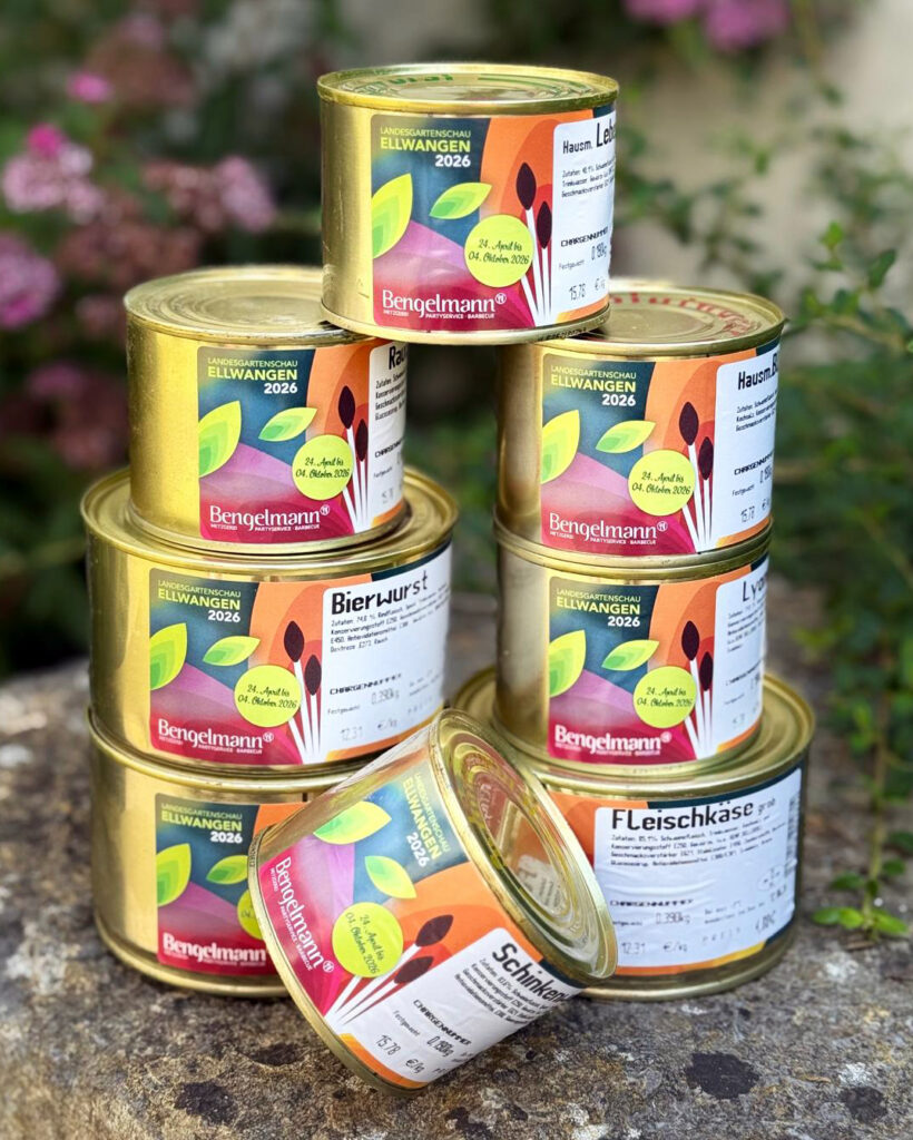 Wurstdosen der Metzgerei Bengelmann im LGS-Design. Der berühmte deutsche Musiker und Entertainer wird am 20. August auf der Sparkassen-Heimatbühne im Stadtpark auftreten.